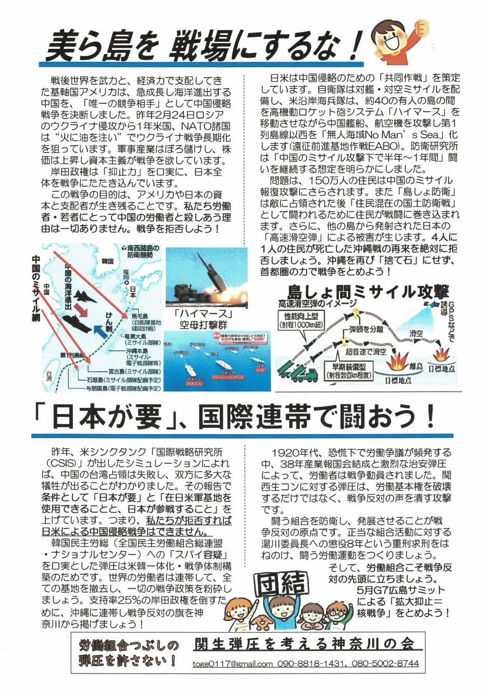 韓国民主労総(全国民主労働組合総連盟・ナショナルセンター)への「スパイ容疑」を口実とした弾圧は米韓一体化・戦争体制構築のためです。世界の労働者は連帯して、全ての基地を撤去し、一切の戦争政策を粉砕しましょう。支持率25%の岸田政権を倒すために、沖縄に連帯し戦争反対の旗を神奈川から掲げましょう!